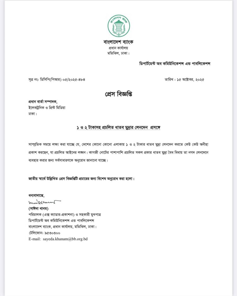 এতে বলা হয়েছে যে, সম্প্রতি লক্ষ্য করা যাচ্ছে দেশের কোনো কোনো এলাকায় ১ ও ২ টাকার ধাতব মুদ্রা লেনদেন করতে কেউ কেউ অনীহা প্রকাশ করছেন। এটি প্রচলিত আইনের লঙ্ঘন।