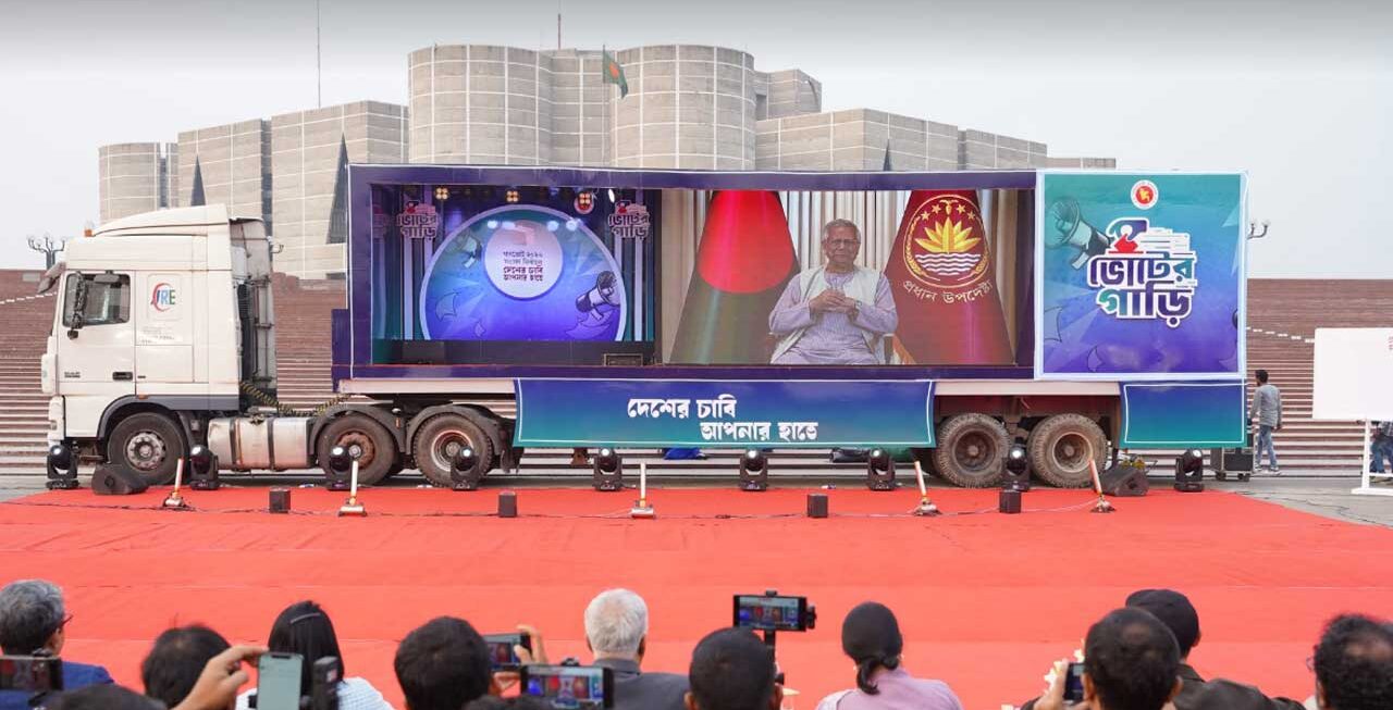 অনুষ্ঠানে উপস্থিত থেকে ফিতা কেটে ভোটের গাড়ির উদ্বোধন করেন তথ্য ও সম্প্রচার উপদেষ্টা সৈয়দা রিজওয়ানা হাসান, সংস্কৃতি উপদেষ্টা মোস্তফা সরয়ার ফারুকী, নির্বাচন কমিশন সচিবালয়ের সিনিয়র সচিব আখতার আহমেদ এবং প্রধান উপদেষ্টার প্রেস সচিব শফিকুল আলম।