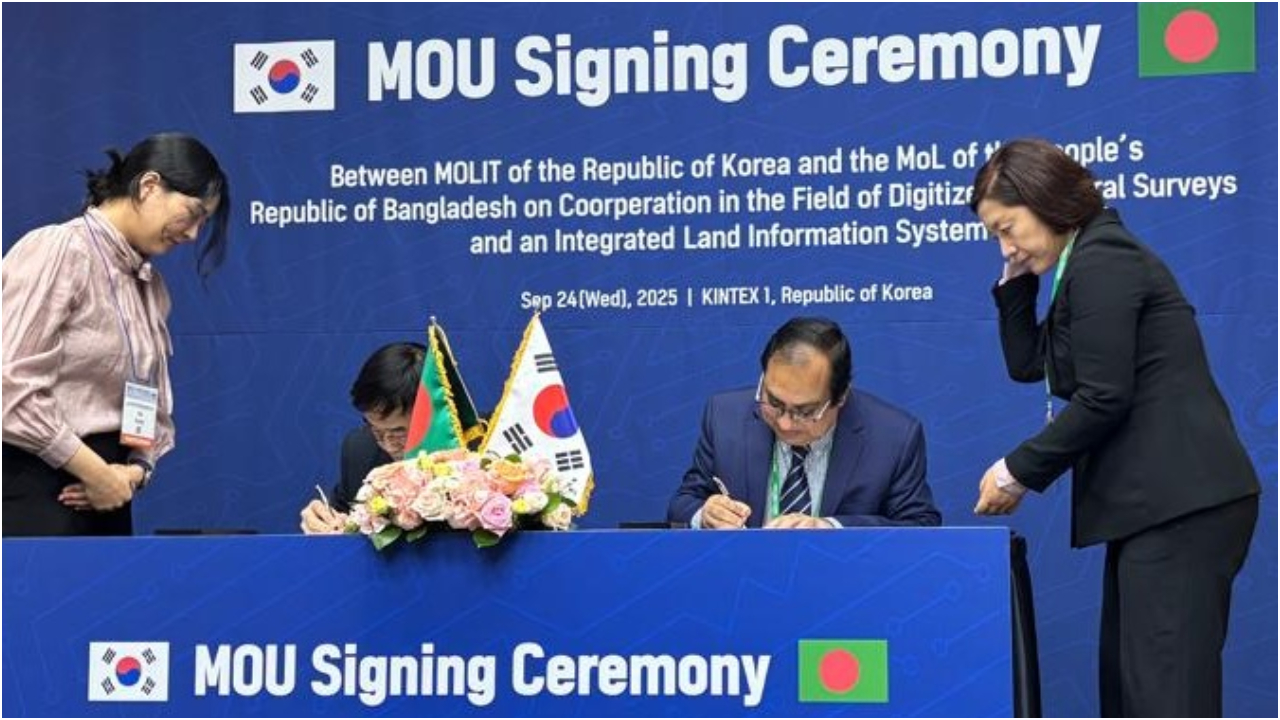 দক্ষিণ কোরিয়ায় আয়োজিত 2025 K – GEO Festa-এ দক্ষিণ কোরিয়ার Ministry of Land, Infrastructure and Transport এবং বাংলাদেশ সরকারের ভূমি মন্ত্রণালয়ের মধ্যে ডিজিটাইজড ক্যাডাস্ট্রাল সার্ভে এবং সমন্বিত ভূমি তথ্য ব্যবস্থাপনা সিস্টেম বাস্তবায়ন বিষয়ে একটি সমঝোতা স্মারক (MOU) স্বাক্ষরিত হয়।