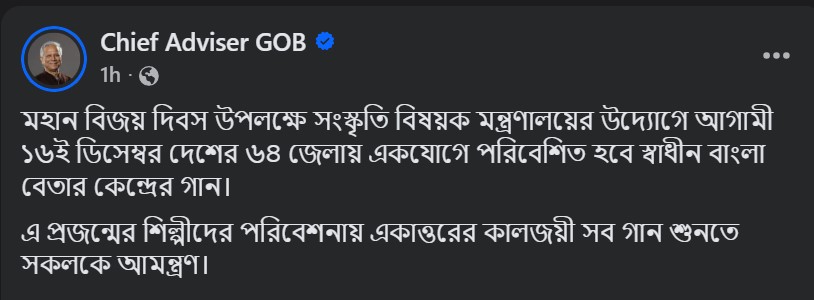 শনিবার (৬ ডিসেম্বর) অন্তর্বর্তী সরকারের প্রধান উপদেষ্টার অফিসিয়াল ফেসবুক পেজ থেকে প্রকাশিত এক ঘোষণায় জানানো হয়— এই আয়োজনের মাধ্যমে নতুন প্রজন্মের শিল্পীরা একাত্তরের অমর সংগীতগুলোর পুনঃ পরিবেশনা করবেন।
