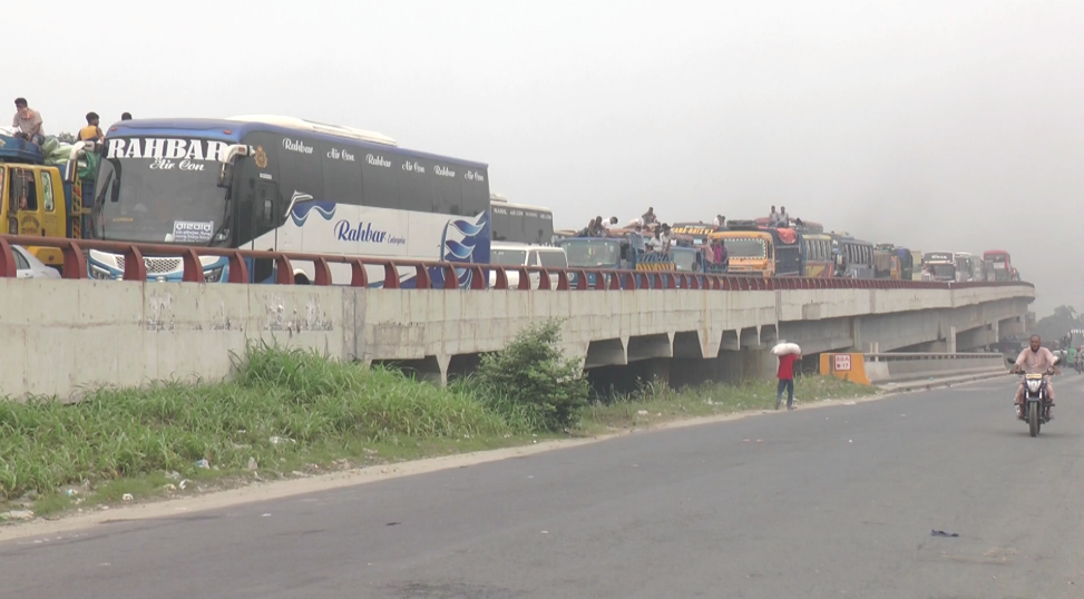 যমুনা সেতুর পশ্চিম সংযোগ মহাসড়কে সকাল থেকেই ১০ কিলোমিটার এলাকাজুড়ে যানজট দেখা দেয়। থেমে থেমে ধীরগতিতে চলছে যানবাহন। সিরাজগঞ্জের কড্ডার মোড় ও হাটিকুমরুল মোড়ে বাসের জন্য দীর্ঘ লাইনে অপেক্ষা করতে দেখা গেছে যাত্রীদের। দুপুরের দিকে যাত্রীর চাপ আরও বেড়ে যায়। দীর্ঘ অপেক্ষার পর বাস না পেয়ে অনেকেই জীবনের ঝুঁকি নিয়ে খোলা ট্রাক বা পিকআপে চড়ছেন ঢাকায় ফেরার জন্য।