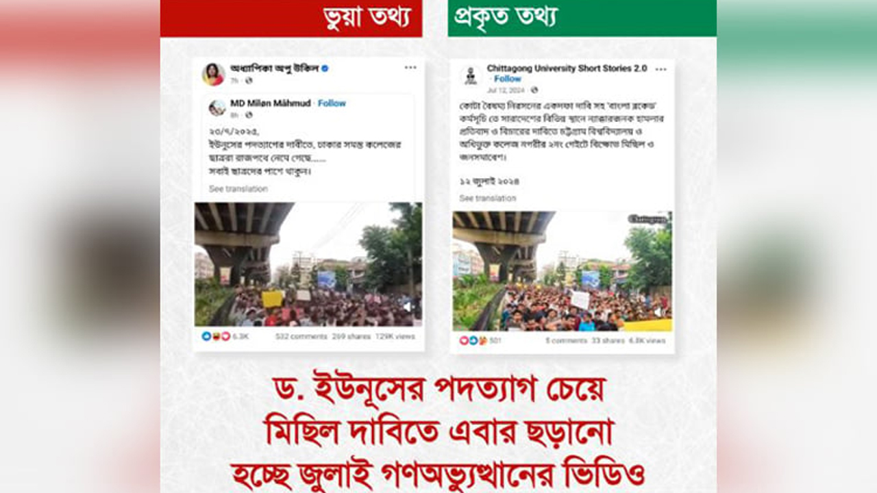 বাংলাদেশে চলমান গুজব, ভুয়া খবর ও অপতথ্য মোকাবিলায় নিয়োজিত রিউমার স্ক্যানারের অনুসন্ধানে দেখা গেছে, প্রধান উপদেষ্টা অধ্যাপক ড. মুহাম্মদ ইউনূসের পদত্যাগ দাবিতে মিছিলের ভিডিওটি ২০২৪ সালের জুলাই গণঅভ্যুত্থানের সময়কার।
