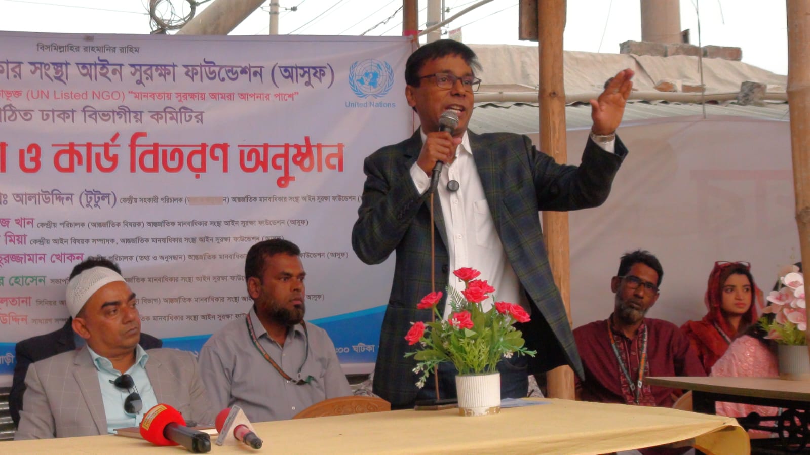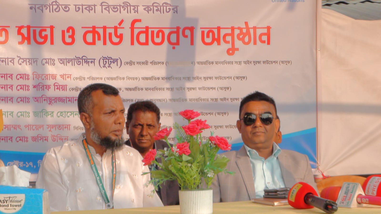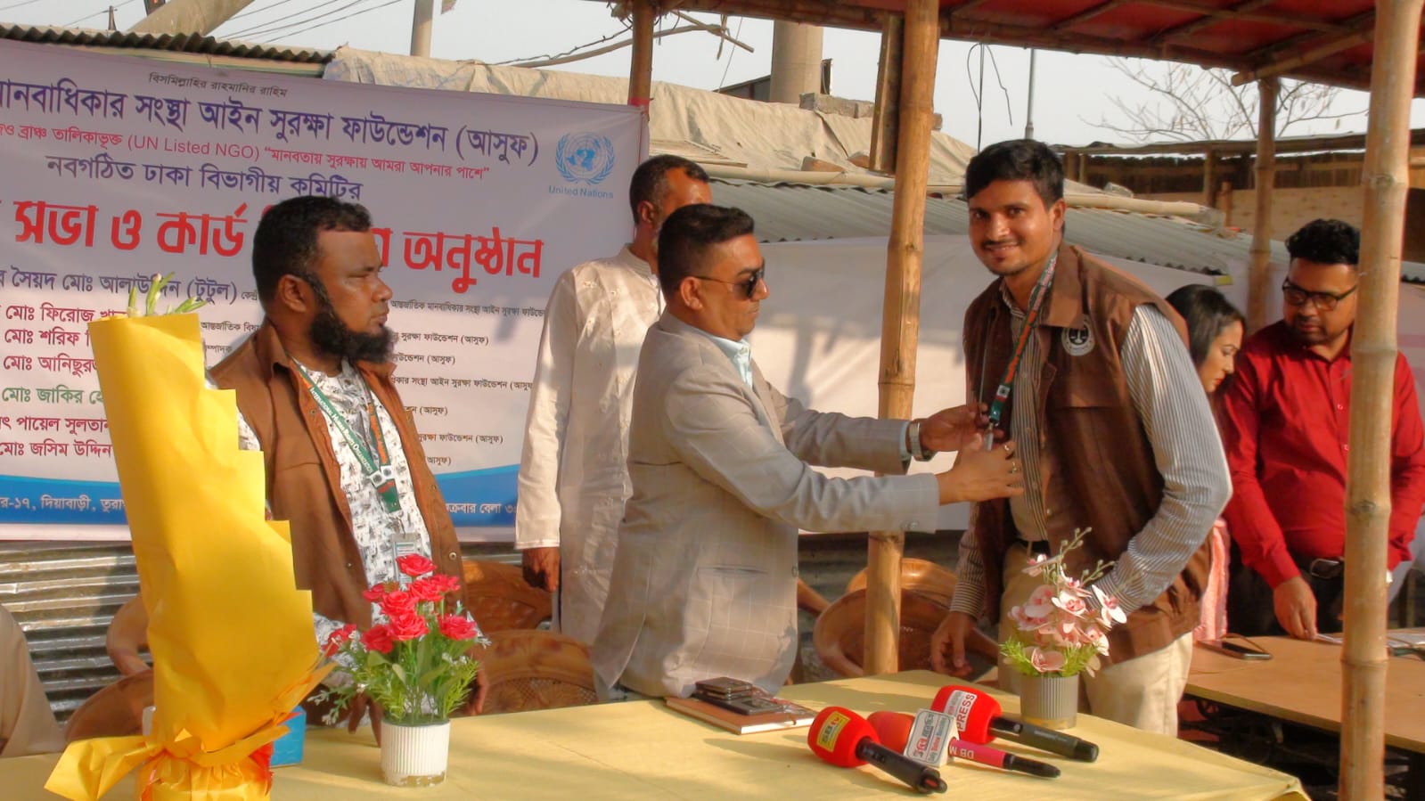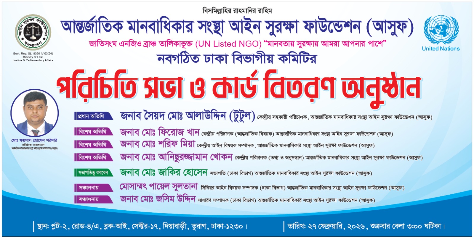 আন্তর্জাতিক মানবাধিকার সংস্থা আইন সুরক্ষা ফাউন্ডেশন (আসুফ)-এর নবগঠিত ঢাকা বিভাগীয় কমিটির পরিচিতি সভা ও কার্ড বিতরণ অনুষ্ঠানে প্রধান অতিথি হিসেবে উপস্থিত ছিলেন জনাব সৈয়দ মোঃ আলাউদ্দিন টুটুল, কেন্দ্রীয় পরিচালক। বিশেষ অতিথি হিসেবে উপস্থিত ছিলেন জনাব উদয় হাকিম সচিব জাতীয় প্রেসক্লাব ঢাকা এবং কেন্দ্রীয় পরিচালক তথ্য অনুসন্ধান জনাব মোঃ আনিসুজ্জামান (খোকন) আরো উপস্থিত ছিলেন ঢাকা বিভাগীয় কমিটির সভাপতি, জনাব মোঃ জাকির হোসেন ও সাধারণ সম্পাদক জনাব মোঃ জসিম উদ্দীন সাংগঠনিক সম্পাদক জনাব মোঃ জুয়েল হোসেন সহ সম্মানিত সদস্যবৃন্দ ও অতিথিবৃন্দ অনুষ্ঠানে সংগঠনের লক্ষ্য ও উদ্দেশ্য তুলে ধরা হয় এবং মানবাধিকার রক্ষায় ঐক্যবদ্ধভাবে কাজ করার অঙ্গীকার পুনর্ব্যক্ত করা হয়।